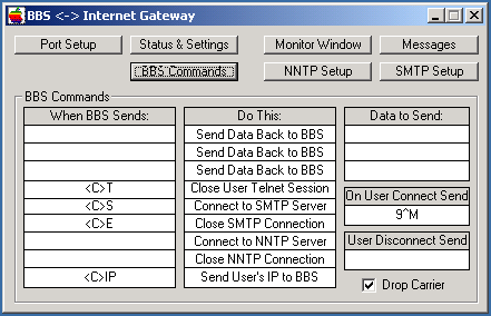 BBS Commands page. This is where you can define commands from the BBS to the Gateway program. Hopefully this is pretty self-explanatory.