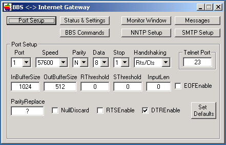 The Port Setup page. Setting up the Com port, and the telnet port to listen on for calls to the BBS.