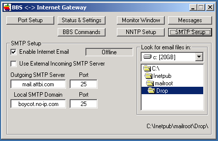 Here is the SMTP Setup page. Another thing I need to put in here is a time interval for checking for email files.