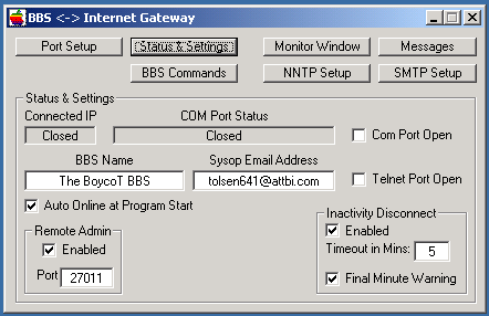 Writing the BBS Gateway program has given me so many multiple ideas that I had to start over from scratch and do a complete re-write. Here are screen shots of what I have so far. It is working as a gateway, but the SMTP, NNTP, & other functions still need to be programmed. It will eventually be released as "donation ware". If you have any questions about it, please email me. mailto:tolsen64@hotmail.com.